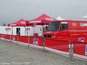 フォードのサービスは、左にシュコダ、右にシトロエン、という位置関係でした。この裏手には、左からプジョー、三菱、スバルとなっていました。まだサービスが始まる前の人がいないときを見計らって、各ワークスのサービスの風景を撮りましたので、雰囲気の参考にしてください。