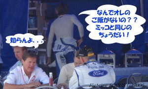 しかし、ミッコの人気の秘密は、やはりファンを大事にする気持ちが現われているところだと思います。このサービスはちょうどお昼時。しかし「リエゾン走行中に車内でパンを食べる」というわけにも行かないので、このサービスの30分を使って食事。さらに、食事中もボスとの作戦会議もあったりして、忙しいはず。その状況は、右写真のような感じです。コ・ドライバーのヤルモ・レンティネンと食事をしながら、ボスと話し合いです。ちなみに、ミッコとボスの間にあるボトルは、ハインツのトマトケチャップです(どーでもいーだろ、そんなこと(爆))。